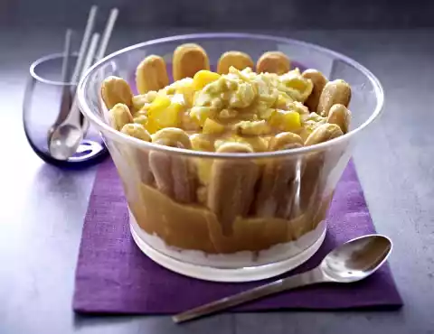 Spread some cream on the bottom of a bowl with a straight, high rim. Place the lady fingers in the cream at the edge of the bowl. Fold apple compote in streaks under the rest of the cream and fill into the bowl.