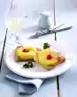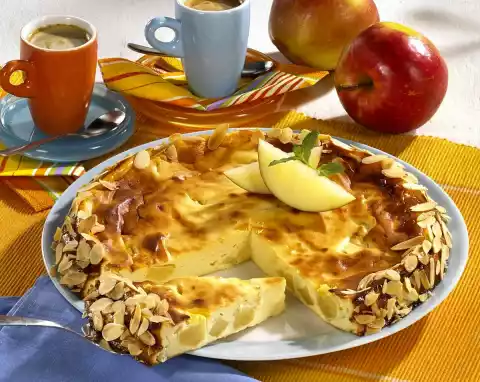 Cut apples into pieces. Mix with lemon juice. Cream butter and diabetic sweetener. Separate eggs. Mix in the egg yolks one after the other. Stir in pudding powder and quark. Beat egg white and salt until stiff. First add apple pieces, then egg white to the quark mixture. Grease a springform pan (26 cm Ø) and sprinkle with flour. Fill in the quark mixture and smooth it down. Bake in the preheated oven (electric cooker: 175 °C/ convection oven: not suitable/ gas: level 2) for approx. 45 minutes. Loosen the rim and let it cool down in the tin on a grid. Roast the almonds in a pan until golden brown, take them out and let them cool down. Remove the cake from the pan and place it on a plate. Stir apricot jam until smooth. Spread the cake rim with it. Press the almonds to the edge. Decorate the cheesecake with apple wedges and mint