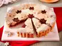 In the meantime, mix the cream firmer with 1 teaspoon of sugar. Whip the cream with the whisk of the hand mixer until stiff, while letting the cream setting agent trickle in. Spread the cake evenly with 3/4 of the cream. Decorate cake edge with hazelnut leaves. Pour the rest of the cream into a piping bag with a star-shaped spout. Spray the cream onto the top edge of the cake in a wavy pattern. Cut the apple quarter into 6 slices. Decorate the cake with the apple slices, remaining cinnamon and cinnamon stars