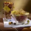 Cut the flesh into small pieces. Melt the remaining sugar until golden brown. Deglaze with lemon juice. Turn apple pieces in it, let cool down. Serve soufflé with prepared apples, cream tuff, mint leaves and cinnamon dusting.