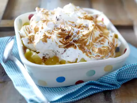 Fold in cookies. Spread loosely on the apple compote. Brown very briefly with a kitchen gas burner or under the hot oven grill. Dust with icing sugar.