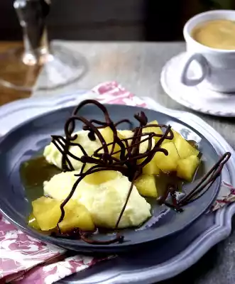Cut the semolina into dumplings with 2 tablespoons. Arrange dumplings and apple compote on plates. Carefully remove the chocolate branches from the ice water, let them drip off slightly and arrange on plates.