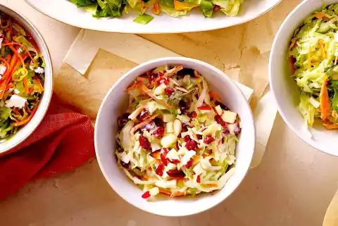 Clean, wash and cut the cabbage into quarters. Cut cabbage into fine strips from the stalk. Mix with vinegar and well 1⁄2 tsp. salt, knead well with your hands. Roast the almonds in a pan without fat and let them cool down.