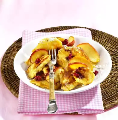 Grate peeled apples roughly and fold into the dough. Cut remaining apple quarters into slices. Heat clarified butter in two large pans. Briefly sauté half of each apple slices, fill in the dough, spread cranberries in small heaps and bake at medium heat until golden brown. Cut the dough into pieces with the help of 2 forks, turn it and fry it to the end. Dust with icing sugar and arrange on plates