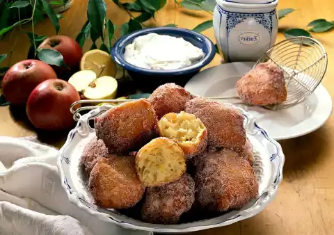 Finely dice apples and fold into the dough. As soon as the frying temperature is reached, use 2 tablespoons to cut off small dumplings. Do not bake more than 3-4 at a time in hot fat, because the pastry will still rise and must be able to swim freely.