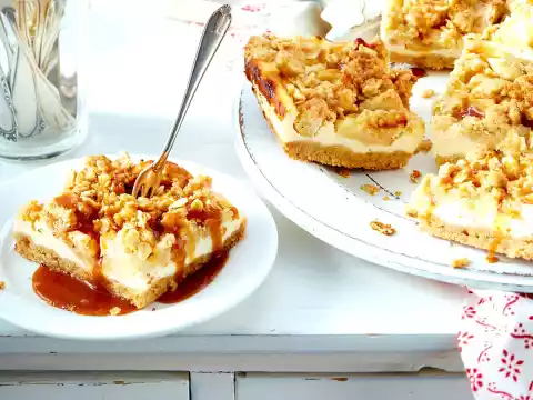 Spread the quark mixture on the pre-baked crumble base. Spread the cinnamon apples on top. Crumble the rest of the dough as crumbles. Bake in a hot oven at the same temperature for about 35 minutes. Let the cake cool down on the baking tray.