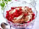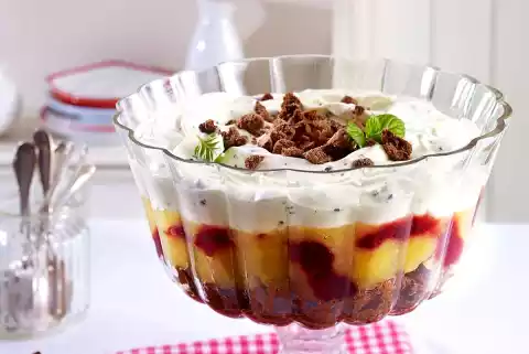 Coarsely crumble the cookies with your hands and, except for about 2 tbsp. for decoration, place them in a large glass bowl (approx. 2 l capacity). Spread the compote on top, and add the cranberries in splotches. Let it cool down.