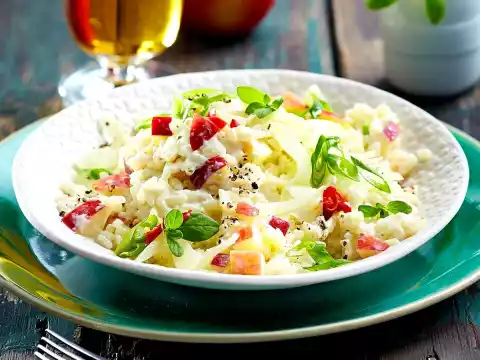 Clean and wash the fennel and remove the stalk. Cut the fennel into very thin strips. Clean and wash spring onions and cut them into thin rings. Wash and quarter the apples and remove the core.