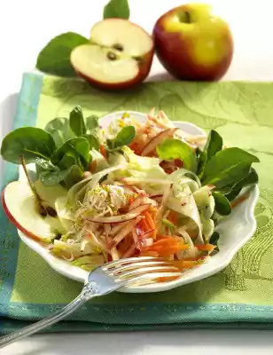 Sort the sprouts, rinse and drain. Clean and wash the salad. Mix prepared salad ingredients and marinade. Use a peeler to slice the cheese into fine shavings and sprinkle on top. Arrange and garnish with apple slices