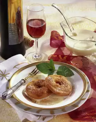 Mix egg yolk, flour, wine, milk, salt and sugar. Beat egg whites until stiff and fold into the dough. Peel apples and cut out the core. Cut apples into 12 slices and sprinkle with lemon juice. Turn the apple slices in the dough and fry in hot oil until golden brown. Drain on kitchen paper. Arrange apple tartlets with some sauce on plates. Dust with cinnamon and sugar. Decorate with mint.