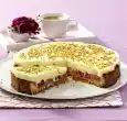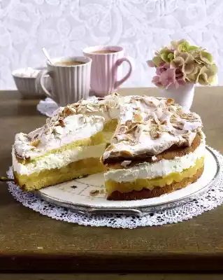 Add 150 g sugar and continue beating until the sugar has dissolved. Spread the meringue loosely on the dough, leaving a free edge of about 1 cm all around. Sprinkle meringue with almond flakes. Bake in the preheated oven (electric cooker: 175 °C/ convection oven: 150 °C/ gas: level 2) for approx. 30 minutes. If necessary, cover with aluminium foil about 10 minutes before the end of the baking time. Remove the cake from the oven, place it on a cake rack, remove from the edge of the mould and let it cool in the mould. Remove from the tin and cut through 1 x horizontally. Place the cake base on a plate and surround it with the edge of the mould. Wash, peel and quarter the apples, cut out the core. Cut quarter into cubes. Boil up 300 ml apple juice, apple pieces, 1 packet vanilla sugar and 50 g sugar, cover and simmer for 6-8 minutes. Stir pudding powder and 50 ml juice until smooth.