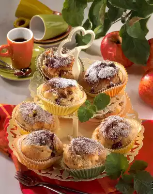 Carefully fold in apple pieces and chocolate drops. Put 2-3 paper baking cups into each other and fill up to 3/4 with dough. Bake in the preheated oven (electric cooker: 200°C/ gas: level 3) for 25-30 minutes until golden brown. Serve dusted with cocoa and icing sugar. Results in approx. 20 pieces