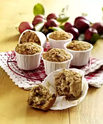 Dann werden die beiden Mischungen miteinander vermischt. Den geriebenen Apfel unterheben. Die Muffinbecher fast voll füllen. Im Ofen bei 175°C/350°F/Gasmarke 4 ca. 20-25 Minuten backen. Vor der Entnahme aus der Form 10 Minuten abkühlen lassen.