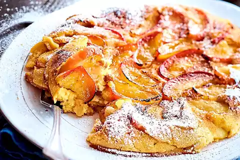 Sprinkle an ovenproof pan (26 cm Ø) with 1 tablespoon of sugar. Place the apple slices in a circle in the pan. Spread 2 tablespoons of butter in flakes on top. Heat until the butter has melted. Pour the dough evenly over the apples. Drain the raisins, catch the rum and sprinkle the raisins on the dough. Bake for about 2 minutes. Then bake in a preheated oven (electric cooker: 200 °C/circulating air: 180 °C/gas: see manufacturer) for 10-15 minutes until golden brown.