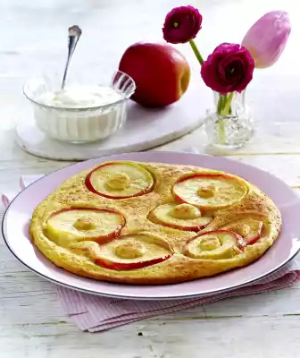 Melt the fat. Whisk eggs and 60 g sugar with the whisk of the hand mixer until creamy. Stir in fat and 375 ml milk. Mix flour, baking powder and salt and stir in. Heat up the clarified butter in portions in a pan (approx. 22 cm Ø). Add 6-8 apple slices each (depending on the size of the apple slices) and braise for 2-3 minutes while turning. Add 174 of the dough each time. Bake at medium heat until golden on each side. Remove from the pan and keep warm. Bake 3 more pancakes from the remaining dough