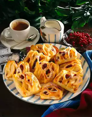 Drain the cranberries. Roll out 1/3 of the dough thinly. Roll out a grid with a grid roller. Roll out the remaining dough to a square (approx. 28x28 cm). Mark 16 squares (7x7 cm each). Separate the egg. Put apple slices and cranberries in the middle of the squares, brush the edges with egg white. Put a grid on top and press between the apples. Cut out the 16 squares with a sharp knife. Whisk egg yolk and cream.