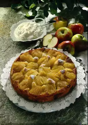 Mix flour, baking powder and almonds, add and mix everything to a smooth dough. Grease a springform pan (26 cm Ø) and fill in the dough. Place the apples on top with the cut side facing upwards.