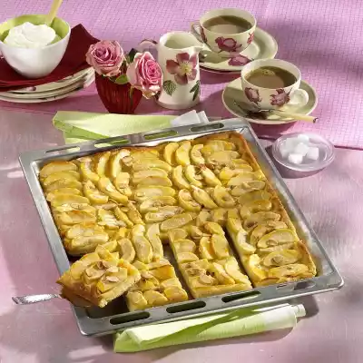 Melt 50 g butter, let it cool down a little. Warm the milk lukewarm. Crumble yeast into it and dissolve it. Put flour, diabetic sweetener and salt in a bowl. Add melted butter, yeast milk and egg, knead everything with the dough hooks of the hand mixer. Cover and leave to rise in a warm place for about 30 minutes. Cut apples into slices. Grease a fat pan of the oven (32 x 39 cm). Knead the yeast dough again and roll out thinly on the fat pan. Press the dough at the edge with your hands. Spread apple slices on top, add 50 g butter in flakes. Bake in the preheated oven (electric cooker: 175 °C/circulating air: 150 °C/gas: level 2) for approx. 45 minutes. Take out and let cool down a little. Warm up the apricot spread and spread on apples. Roast almond flakes in a pan without fat until golden brown. Sprinkle almonds on the cake