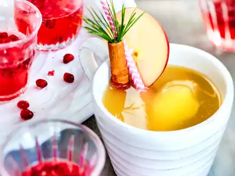 For the punch, wash the ginger and cut into thin slices with the skin. Boil up apple juice, pear nectar, ginger and cinnamon sticks. Remove from the heat and let it simmer for 5-10 minutes. Wash the apple. Cut off 8 thin slices and cut each one once to the core.