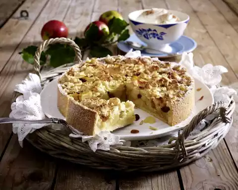 Rinse and drain the raisins. Knead 400 g flour, butter, egg, 120 g sugar, vanillin sugar and baking powder first with the dough hook of the hand mixer, then with your hands to a smooth dough. Grease a springform pan (28 cm Ø) and dust with flour. Weigh 700 g dough and roll out round (approx. 35 cm Ø). Line the bottom and sides of the mould with the dough, press down a little, sprinkle with breadcrumbs and chill. Peel apples, cut out the core and cut the fruit flesh into pieces.