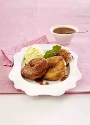 Mix cinnamon and 50 g sugar, turn apple rings in it. Arrange apple rings and vanilla ice cream on plates, drizzle with caramel sauce and decorate with lemon balm