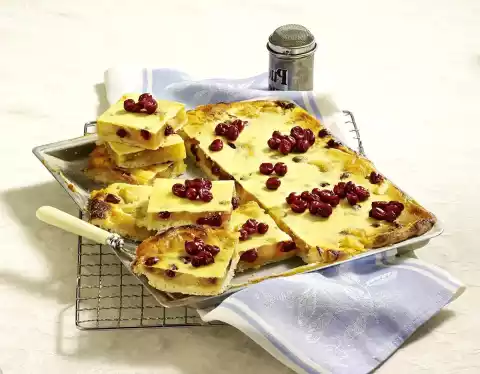 Mix 50 ml apple juice, 2 tablespoons sugar and pudding powder. Boil 250 ml apple juice. Add apples and simmer for about 5 minutes. Stir in the pudding powder and bring to the boil again. Add cranberries, except 2 teaspoons for decoration, and simmer for 1 minute. Remove from heat and let cool a little. In the meantime roll out the yeast dough to a rectangle (32 x 39 cm) and line a greased, flour-strewn fat pan of the oven (32 x 39 cm) with it. Add apple-cranberry compote and smooth it down. Spread the quark mixture evenly on top. Bake in the preheated oven (electric cooker: 200 °C/ convection oven: 175 °C/ gas: level 3) for 40-45 minutes. Remove the cake and let it cool down. Decorate with remaining cranberries