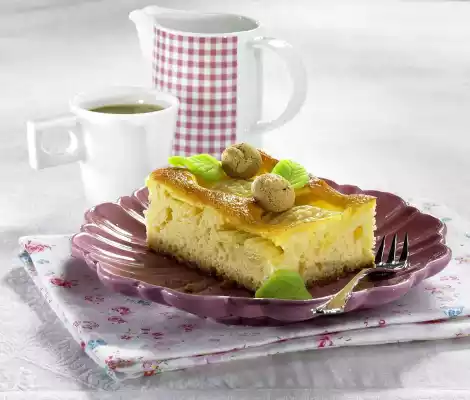 Put quarter in lemon water. Cut fat into pieces. Cream fat, 250 g sugar, lemon peel and vanilla sugar with the whisks of the hand mixer. Stir in 4 eggs one after the other. Mix flour and baking powder and stir in alternately with the milk. Grease the fat pan of the oven (32 x 39 cm) and dust with flour. Put the dough into the fat pan and smooth it down. Cut the apple quarters several times and spread them evenly on the dough, pressing them in slightly. Pour sand casting into the spaces in between. Bake the cake in a preheated oven (electric cooker: 175 °C/ convection oven: 150 °C/ gas: level 2) for approx. 40 minutes. Meanwhile knead 70 g marzipan, icing sugar and some food colouring. Divide the marzipan into approx. 36 balls and form leaves.