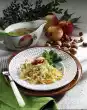 Grate 50 g marzipan. Mix 1 egg and marzipan until the marzipan is dissolved. Stir in 1 egg, sour cream, pudding powder and 30 g sugar. Wash lemon, grate dry and grate peel thinly. Halve the lemon, squeeze the juice. Peel and quarter apples, remove core.