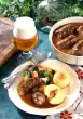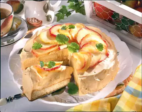 Add slices to the stock and cook over a low heat for 1-2 minutes. Remove from the brew with a skimmer and lay carefully on kitchen paper. Let it cool down. Soak the gelatine in cold water, squeeze it out and carefully melt it at low heat in a small pot. Add the gelatine drop by drop to the sea buckthorn puree while stirring constantly. Keep cold. In the meantime, whip cream until stiff. As soon as the sea buckthorn begins to gel, fold in the cream in portions. Place the cake base on a cake plate. Spread half of the sea buckthorn cream on the cake base, spread apple slices on top. Spread the cake with the remaining sea buckthorn cream all around. Put the cake in a cool place for about 10 minutes and then cover with the apple slices. Put the cake in a cool place for about 2 hours and serve it decorated with lemon balm as you like