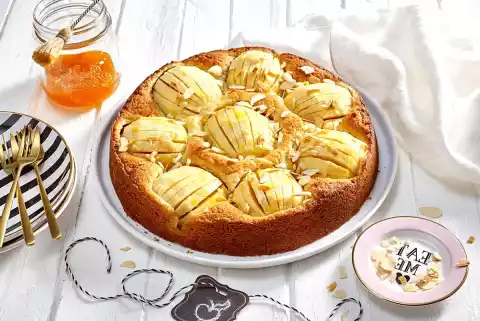Put the dough into a greased springform pan (26 cm Ø), smooth it down, distribute the apple halves evenly and press them lightly into the dough. Bake in the preheated oven (electric cooker: 175 °C/ convection oven: 150 °C/ gas: see manufacturer) for approx. 55 minutes. Remove the cake, let it cool down on a cake rack and remove from the tin. Roast the almonds in a pan without fat while turning for approx. 5 minutes. Heat up the jam and brush the cake with it. Sprinkle with almonds.