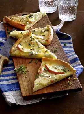 Cut apples into thin slices and spread them on the pizza. Coarsely crumble the gorgonzola over it. Bake in the preheated oven (electric oven: 250 °C/ convection oven: 225 °C/ gas: see manufacturer) on the middle shelf for 12-14 minutes.