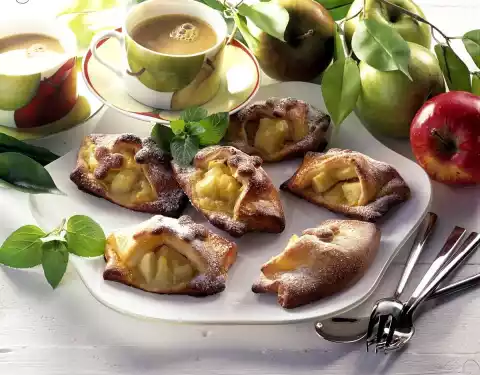 Fold over the other half, fold in the moistened narrow sides slightly and press lightly. Place apple pockets on a baking tray lined with baking paper. Cut out 9 flowers from the remaining dough. Brush the apple pockets with water and place the blossoms on top, press lightly. Bake in a preheated oven (electric cooker: 200 °C/ convection oven: 175 °C/ gas. Level 3) for approx. 15 minutes. Let them cool down on a cake rack. Dust apple pockets with icing sugar