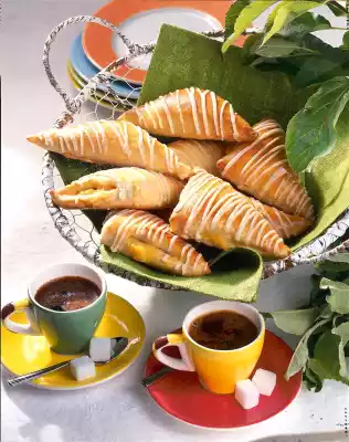 Press the edges firmly together and, if necessary, wheel along the edge with a dough wheel. Bake in the preheated oven (electric cooker: 200 °C/ gas: level 3) for about 15 minutes. Mix the egg yolks and 1 tablespoon of milk and brush the apple pockets with it 10 minutes before the end of the baking time. Let them cool down on a cake rack. Mix icing sugar, remaining egg liqueur and remaining milk. Pour into the freezer bag and cut off a small corner. Decorate apple pockets with it and let them dry. Results in about 10 pieces