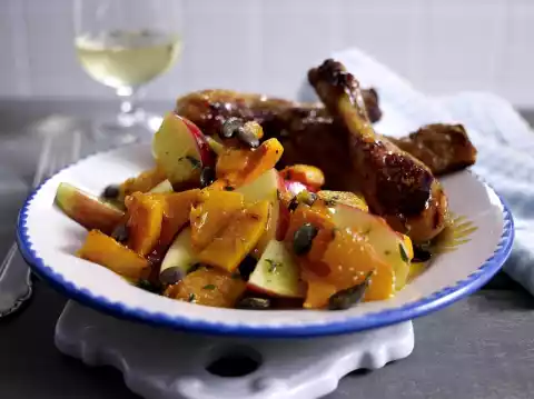 Mix vinegar, remaining lime juice, salt, pepper and honey. Fold in 4 tablespoons of oil. Mix with onions, apples, pumpkin and pumpkin seeds. Serve with the chicken legs.