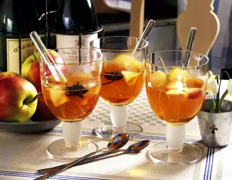 Wash the apples, grate them dry and cut out a slice of apple with stalk from the middle of each one. Cut the remaining apple halves into quarters and remove the core. Cut apples into pieces and put them in a pot together with apple juice, port wine, sugar, cinnamon sticks and aniseed stars and bring to the boil. Simmer at low heat for 3-4 minutes. Finally add cider and bring to the boil again briefly. Pour into punch glasses, decorate with apple slices and serve