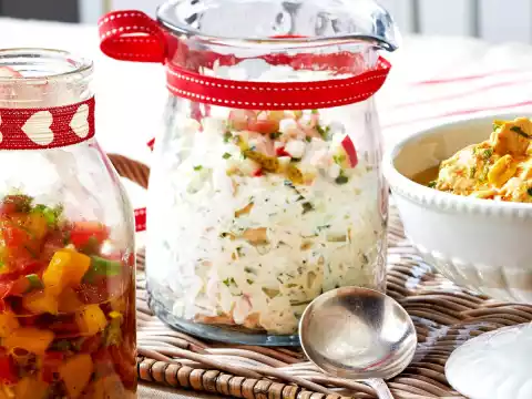 Mix the sour cream, mayonnaise and cucumber stock. Season to taste with salt and pepper. Mix all the ingredients and let it stand.