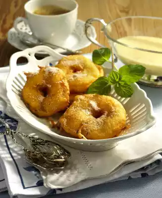 Pull apple rings in portions through the dough and bake in hot clarified butter for about 3 minutes on each side until golden brown. Turn in the cinnamon sugar and keep warm. Decorate with mint. Served with: vanilla sauce