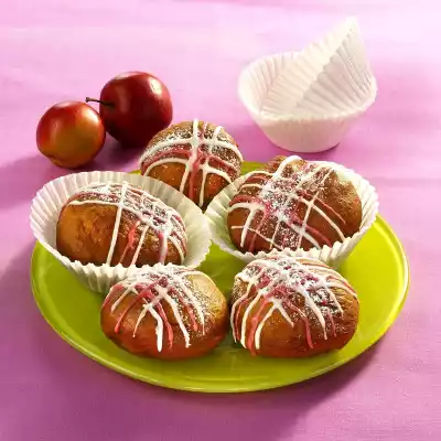 Let it rise again for about 30 minutes. Then knead the dough with your hands and divide into 14 pieces. Form into Berliners with floured hands. Let it rise again for about 30 minutes. Heat the frying fat in a pot or deep fryer (160-180 °C). Fry the doughnuts for 10-12 minutes until golden brown. Mix applesauce and rum. Pour into a piping bag with a garnish syringe or fine perforated spout. Fill the doughnuts immediately and let them cool down. To decorate, mix icing sugar and lemon juice. Colour half red. Fill each into a small bag and cut off a small corner.
