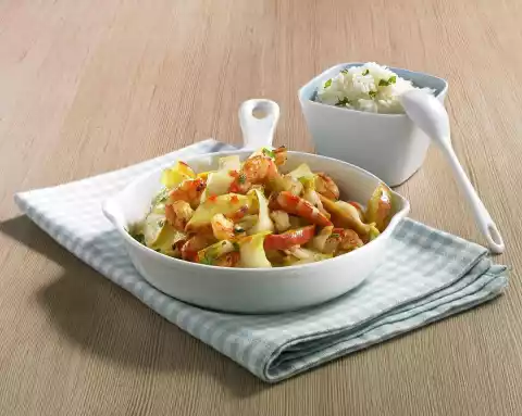 Season prawns with salt, remove from the pan and keep warm. Add apple slices to the pan and fry lightly for about 1 minute. Add asia sauce and 2-3 tablespoons of water and simmer for 1-2 minutes.