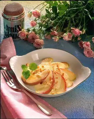 Mix cream double and egg yolk. Beat the egg white until stiff and fold into the egg yolk. Place the apple slices in small ovenproof dishes. Mix the double cream with the cinnamon and place it on the apple slices and sprinkle with almond slivers. Place the moulds in the preheated grill and grill until they are lightly browned. Serve decorated with lemon balm