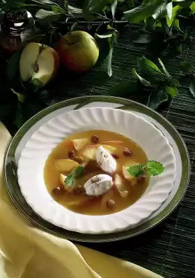 Arrange soup in deep plates. Sprinkle snow dumplings with cinnamon. Serve garnished with lemon balm.