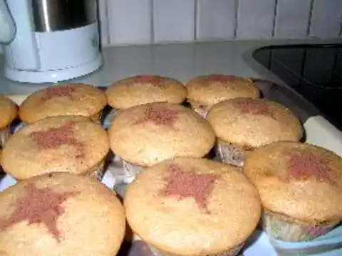 Put one tbsp. of batter into each muffin tin, then add about 2 tsp. of applesauce and fill the tins with the batter. Bake at 180°C on the middle shelf for 20-25 minutes, sprinkle the finished muffins with cocoa if necessary.