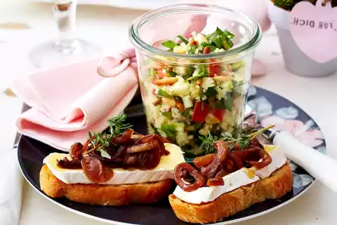 For the crostini cut baguette and camembert into 12 slices each. Heat 2 tablespoons of oil in a frying pan. Fry the baguette in it until golden brown. Cover with camembert and onion confit. Arrange everything.
