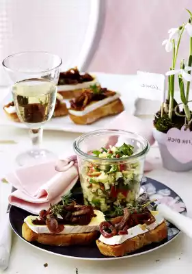 Cut the camembert into about 12 slices. Roast the baguette slices, cover with camembert. Spread onion confit on top, garnish with thyme. Arrange on plates with apple-tabouleh.
