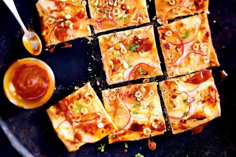 Preheat oven (electric cooker: 220 °C/circulating air: 200 °C/gas: see manufacturer). Line baking tray with baking paper. Roll out the dough thinly. Spread with quark cream and cover with apple slices. Sprinkle with nut flakes and cinnamon sugar. Bake in a hot oven for 12-15 minutes, remove from oven. Sprinkle with caramel and sprinkle with lemon thyme as desired.
