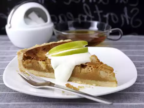 Meanwhile, peel, quarter, core and dice the apples and fold them into the caramel cream. Sprinkle the tart base with breadcrumbs and spread the caramel cream on top. Bake at the same temperature on the lowest rack for 35-40 minutes.