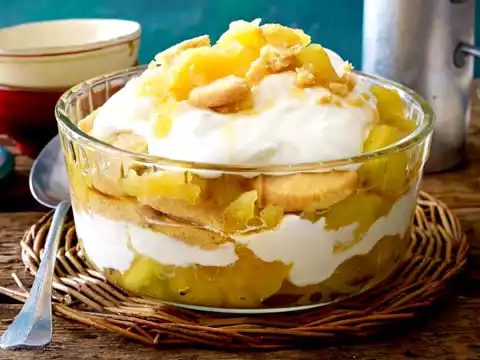 Mix 100 ml apple juice and whiskey. Dip Shortbread one after the other briefly into the whiskey mixture. Pour the apple compote and cream into a bowl. Chill for at least 2 hours.