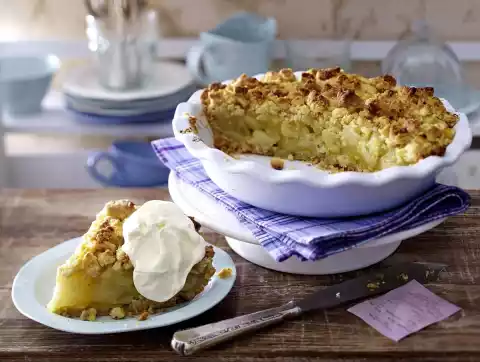 Spread apple compote over it. Spread the remaining crumbles on the compote. Bake in a hot oven for 55-60 minutes. If necessary, cover with aluminium foil about 15 minutes before the end of the baking time. Let it cool down. Serve with crème fraîche.
