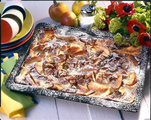 Roll out the dough on a greased deep baking tray. Cover and leave to rise in a warm place for another 30 minutes. Spread the apple mixture on top. Bake in the preheated oven (electric cooker: 175 °C/ gas: level 2) for 12 minutes. Whisk eggs, sour cream and remaining sugar. Spread over the cake. Bake for another 30-35 minutes. Serve dusted with icing sugar