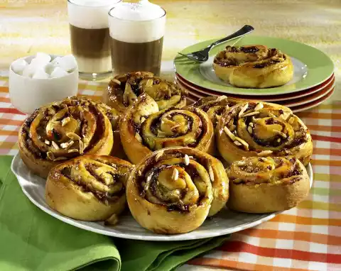Cover the dough and let it rise again for about 30 minutes in a warm place. Briefly knead the yeast dough and roll out into a rectangle (60 x 45 cm) on the floured work surface. Spread plum puree on top, leaving a 2 cm wide edge of dough all around. Sprinkle the steamed apple cubes with the liquid and almond slivers on the coated dough surface one after the other. Roll up the dough from the long side, pressing the open sides. Cut the roll with a saw knife into approx. 16 slices. Cover two baking trays (39 x 32 cm each) with baking paper. Place yeast dough pieces on top. Cover and let rise for about 10 minutes. Put the baking trays one after the other, with convection oven, into the preheated oven (electric oven: 200 °C/ convection oven 175 °C/ gas: level 3) and bake for 35-40 minutes. Remove baking trays from the oven. Bring jelly to the boil while stirring and spread on the hot apple-yeast snails. Let the snails cool down